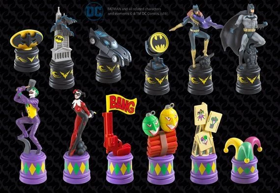 Character precise chess pieces include BATMAN, BATGIRL The JOKER, HARLEY QUINN, BATMOBILE and other iconic pieces. Each measures 2 to 4 inches. Playing board is 18.5 x 18.5”